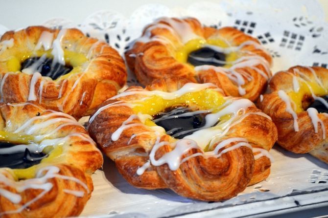 Hivenen suurempi viineri. Keskellä vanilijakreemiä ja luumumarmeladia.