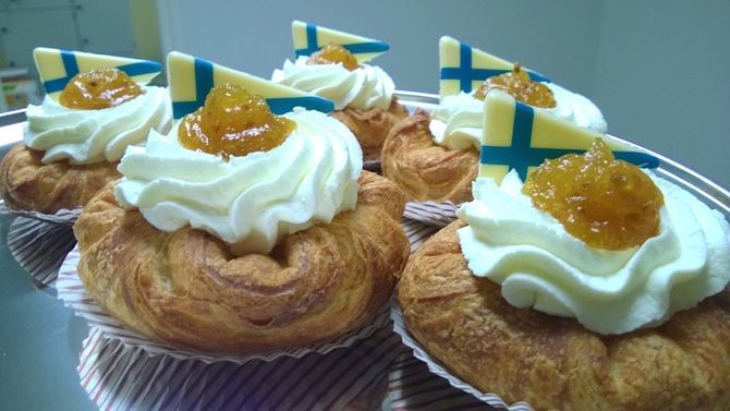 Juhlava wieneri jossa vanilijakreemitäytteen päällä kermavaahtoa ja kotimaista lakkahilloa. Koristeena suomen lippu.